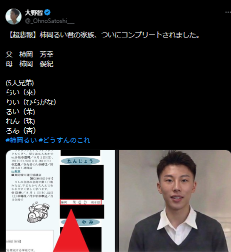 ネット上の情報によると、柿岡家の5人兄弟には、名前の頭文字を「ら・り・る・れ・ろ」で統一するという独特のルールがあるそうです。