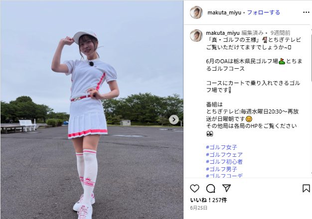 レギュラーは水曜20:30、再放送は日曜8:00(一部地域の編成差あり)。“ゴルフ女子”ブームの中、ラウンドの空気感を伝える役回りは新規ファンの入口に。番組外でも練習の様子や現場ショットをSNSで共有しており、地上波→SNSの二段構えで露出を拡張しています。
