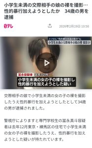 冨永真斗容疑者(34)は、小学生未満の女の子に対し、性的暴行を加えようとする様子などを自身のスマートフォンで撮影した疑いが持たれています。