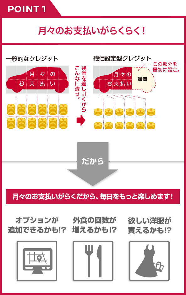 車両価格 − 残価 をベースに分割していくため、月々の負担は抑えられます。