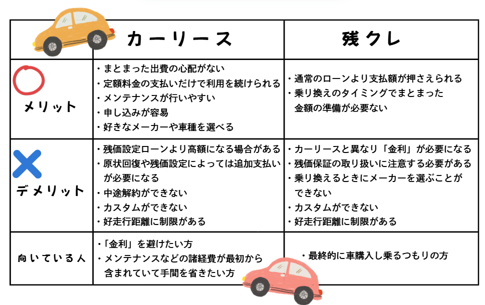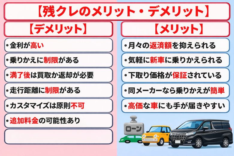 - 残クレは短期間で乗り換える人や月々の負担を重視する人には向くが、長く乗りたい人には不向きな場合もある